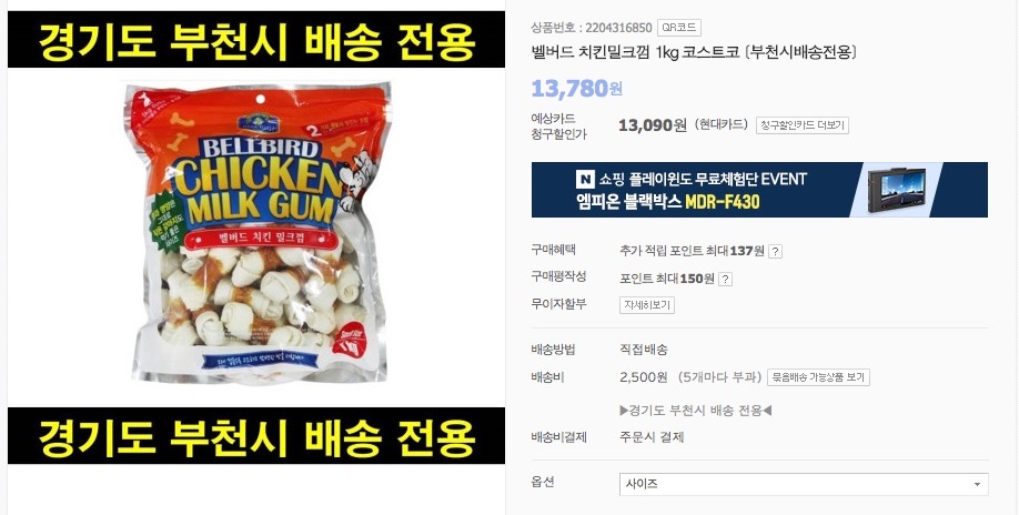 개껌계의 가성비 끝판왕 벨버드 치킨밀크껌을 판매하고 있습니다.