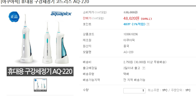 [인터파크아이마켓] ]핫딜! 아쿠아픽 휴대용 구강세정기 코드리스 AQ-220 (48,620원/무료배송) > 상품홍보
