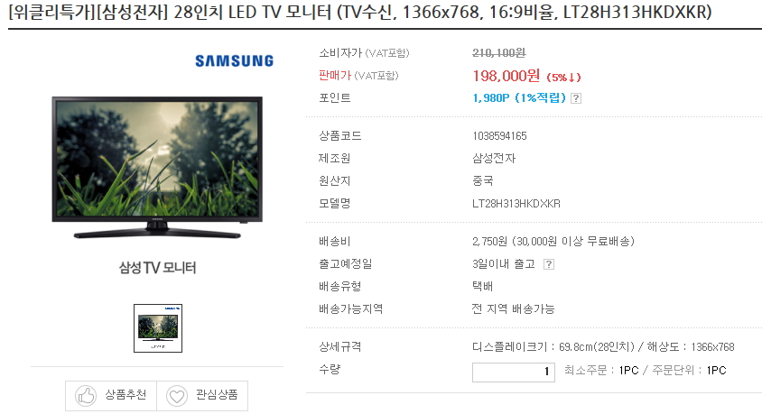 [인터파크] 삼성 28인치 LED TV 모니터 (198,000원/무료배송) > 상품홍보