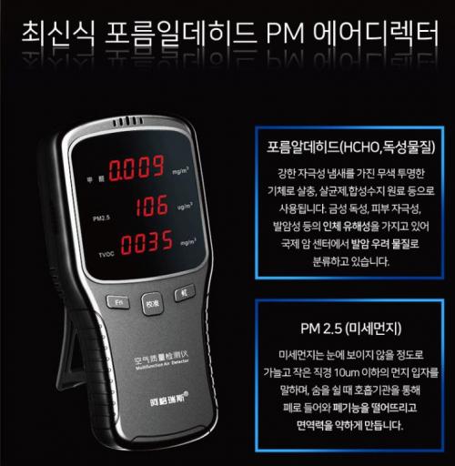 HCHO포름알데히드, TVOC휘발성 유기화합물, PM10, 2.5, 1 세가지의 미세먼지 측정도 가능합니다.