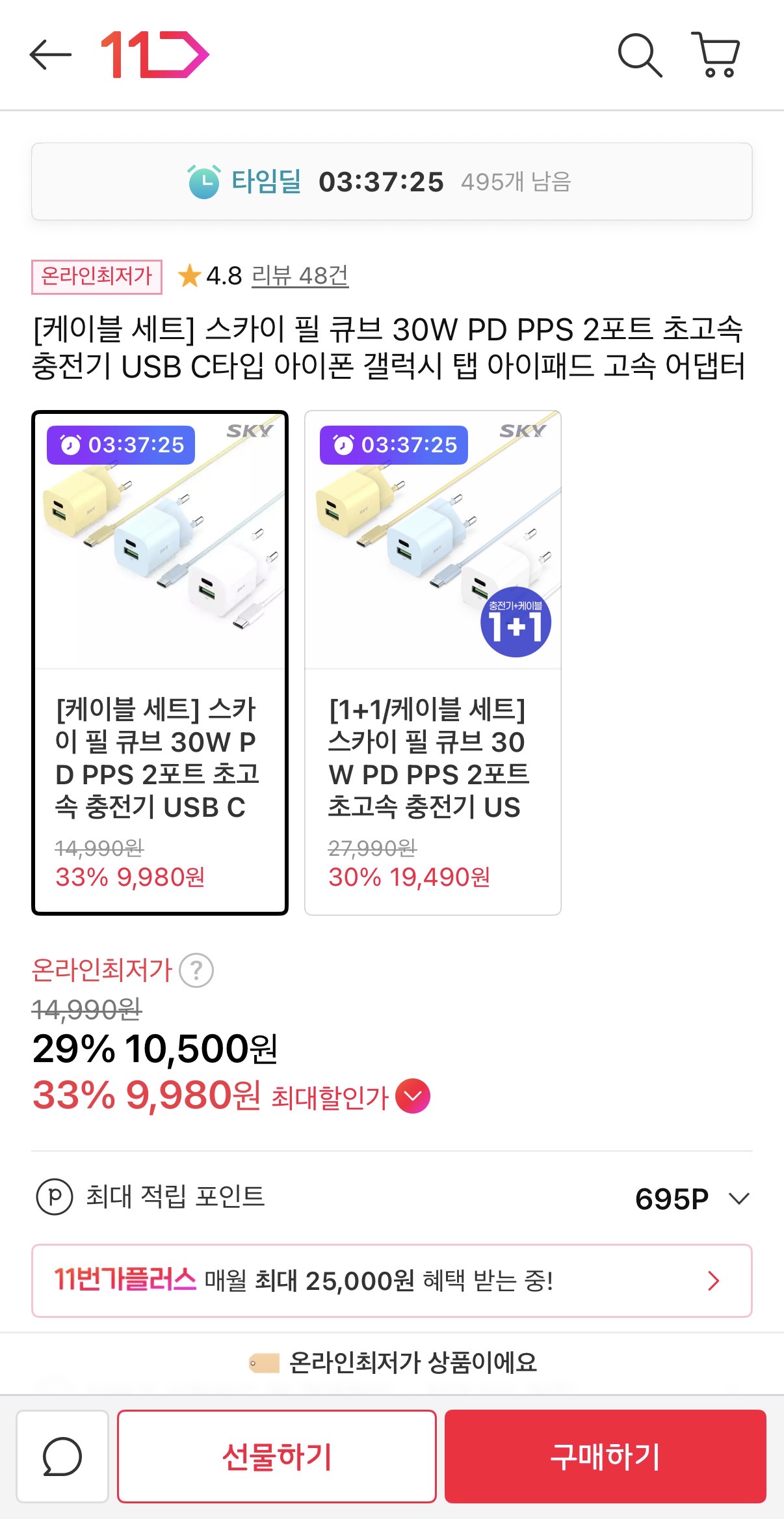 [11번가] 스카이 필 큐브 30W 초고속충전기 (9,980원/무료)