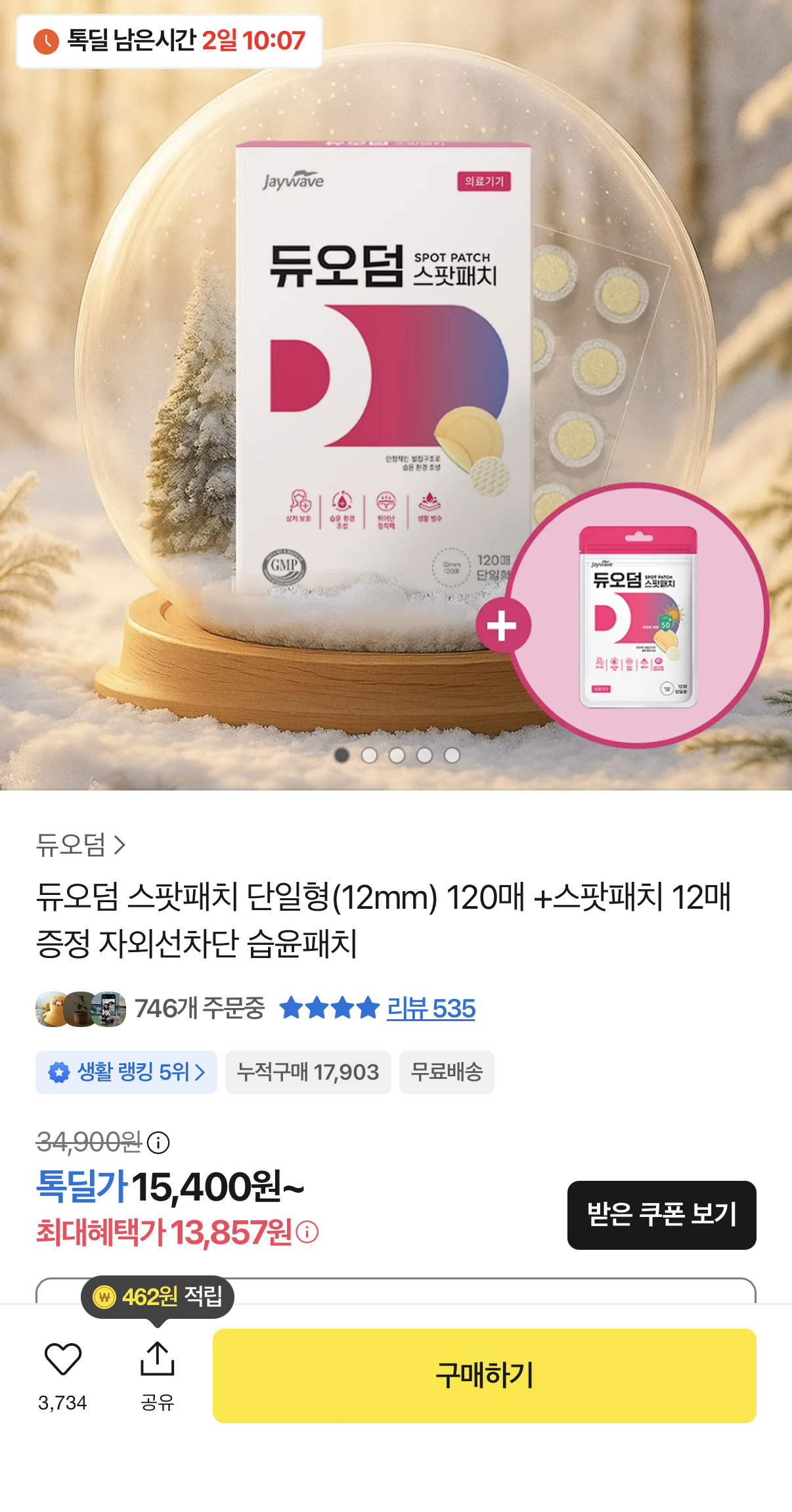 [카카오] 듀오덤 스팟패치 단일형 120매+스팟패치 12매 증정 (13,857원/무료)