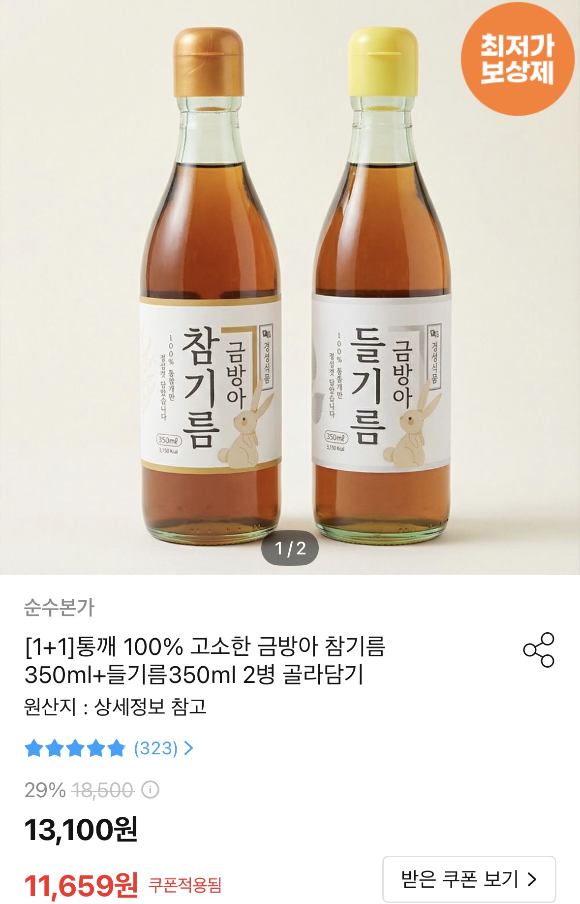 [오늘의집] 통깨 100% 고소한 금방아 참기름350ml+들기름350ml 2병 (11,659원/무료)