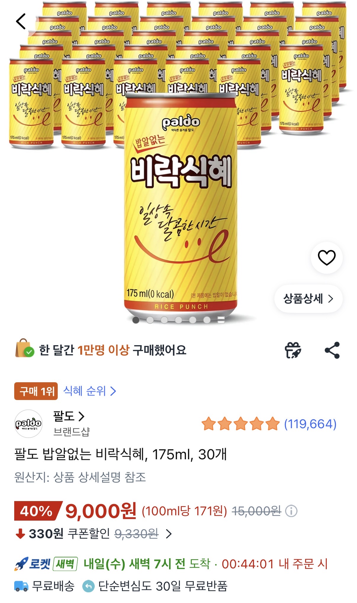 [쿠팡] 팔도 밥알없는 비락식혜 175ml 30개 (9,000원/와우무료)