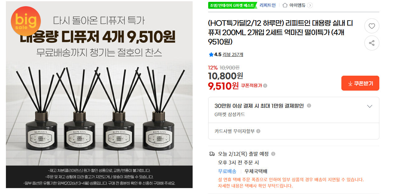[g마켓] 실내 디퓨저 방향제 200ml 4개입 9,510원 / 무배