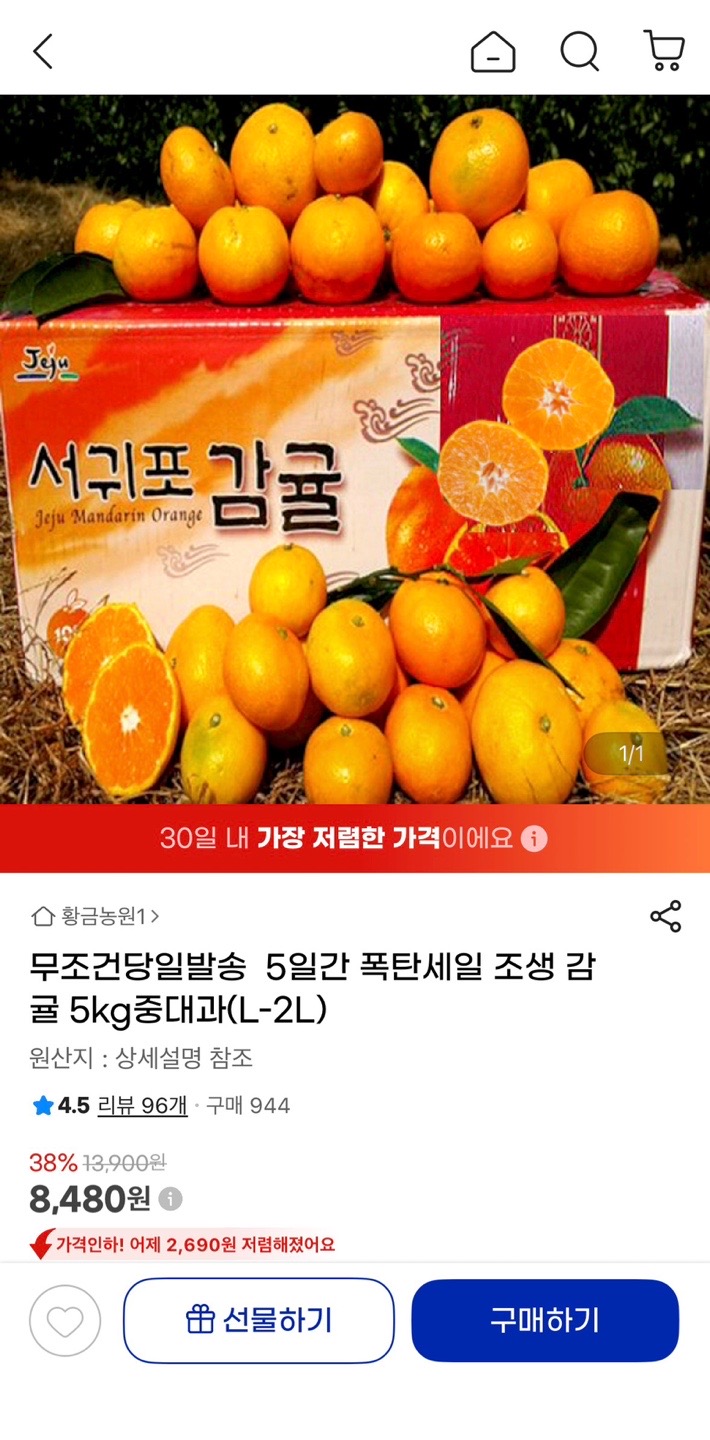 [지마켓] 조생 감귤 중대과 5kg (8,480원/무배)