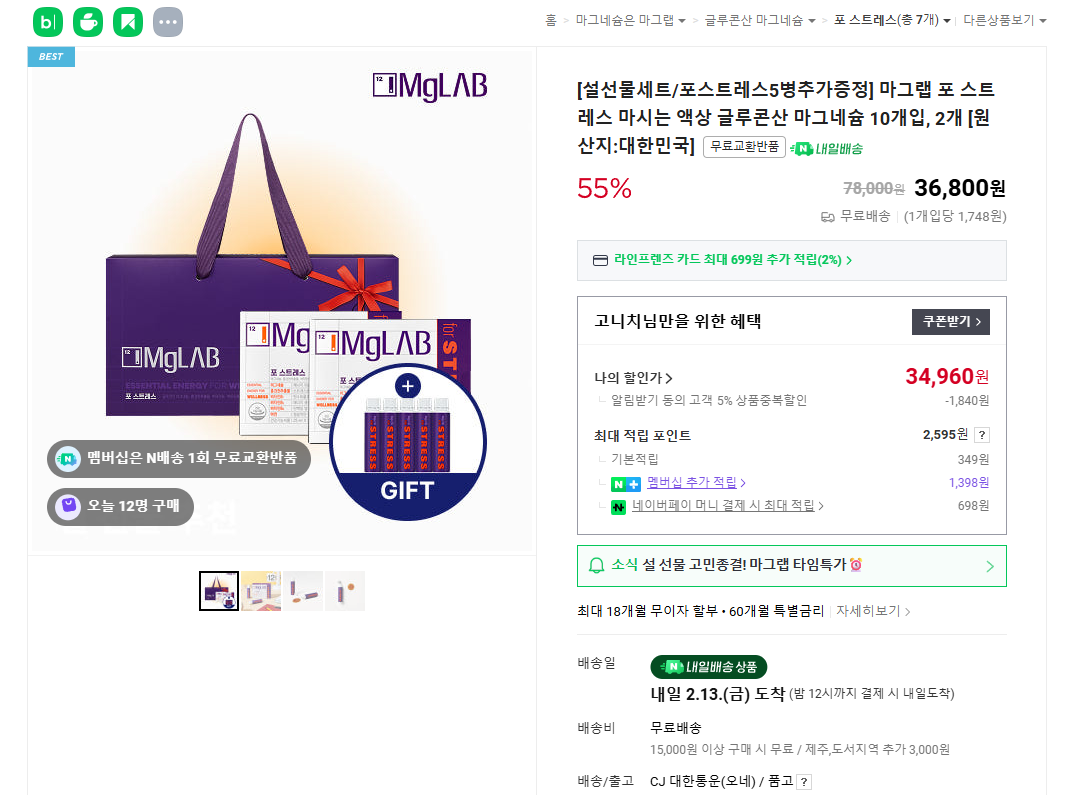 [네이버] 마그랩 포 스트레스 액상 마그네슘 설선물세트 (34,960원 / 무료)