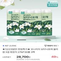 [홈앤쇼핑] 핫딜! 모나리자 보타닉포레 3겹 화장지 30롤 3팩 (28700원/무배)