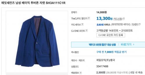 [CJ몰] 에잇세컨즈 남성 베이직 투버튼 자켓 SH3A111C1R (14,000원/2,500원) > 국내핫딜