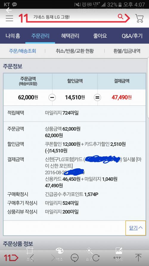 총 46450원 결제했고요. 포인트 1574 준다네요.