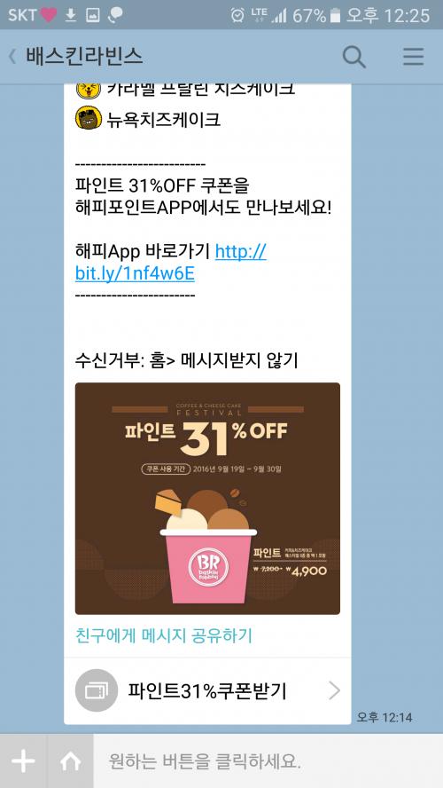 해피앱에서도 되네요. 괜시리 카톡으로 배스킨 친구맺고 차단.ㅎ