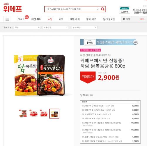 위메프에서는 닭볶음탕 8kg+ 소스1봉을 20,500원에 살 수 있어요.