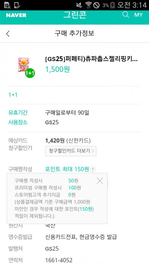 청구할인으로 1420원이며, 네이버페이로 결제