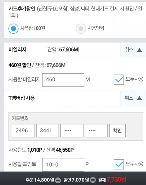 vvip마일리지 할인 + 티멤버십할인 +카드할인 받을시