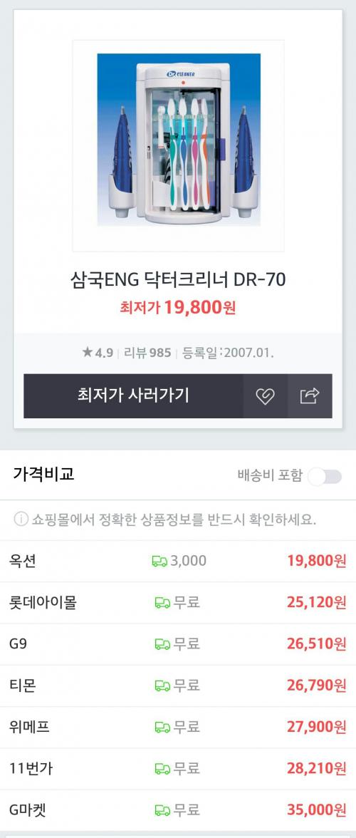 와 저렴하네요 저도 동일제품 사용중인데 좋습니다 자외선에 방열판이 있어서 건조까지되고요 단점이라면 면도기를 따로 걸수가없고 수납칸에 넣으면 저사진처럼 안서있는게 단점이네요 | ||