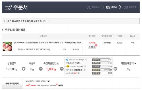제 주문 기준으로 제주 칼집 흑돼지 구이용 500g X 5개 = 19,500원 -> 14,500원에 구매하였습니다. ^^