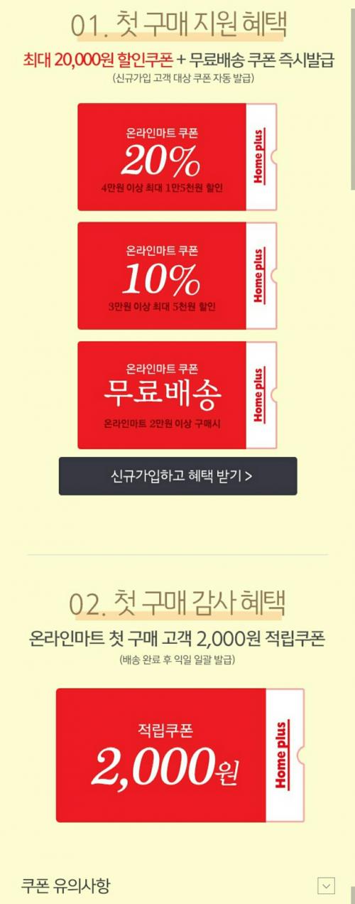 신규가입 시 3만 이상 10퍼 4만 이상 20퍼센트 쿠폰 받습니다