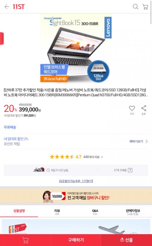 쿠폰할인이 있어서(캡쳐 참고) 가격이 더 좋네요