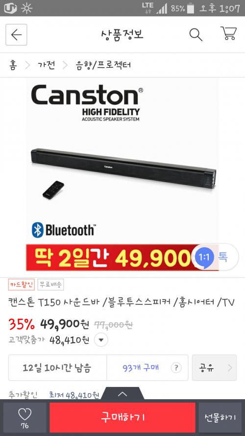 티비에 광출력으로 사용해봤는데요 연결 불량 많고 채널 돌릴 때 마다 광출력 초기화 됩니다. 진짜 비추천. 창고에 처 박아 뒀습니다. | ||