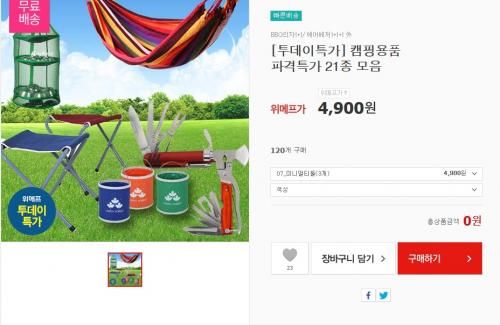 위메프 투데이특가로 캠핑용품 21종이 4900원에 무배로 판매하고있습니다.