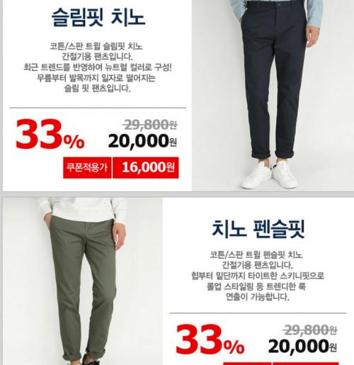 댓글보니까 슬림핏 치노, 치노 펜슬릿은 기존가격 만원이었는데 갑자기 예전문의글 다 지우고 6천원 올려서 만6천원에 판매하는거라네요... 주의하시길.. | ||