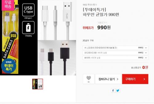 위메프에서 5핀/C타입 케이블을 990원에 무료배송으로 판매하고 있네요... 몇일전에 폰을 V10에서 갤럭시a5 2017