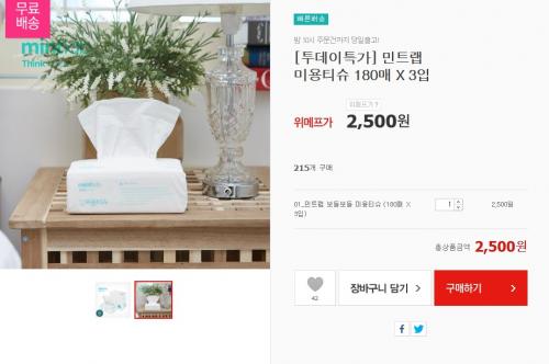 민트랩 미용티슈 입니다. 저번에 위메프에 팔고있어서 2500원에 주문했었는데 또 2500원에 팔고있네요