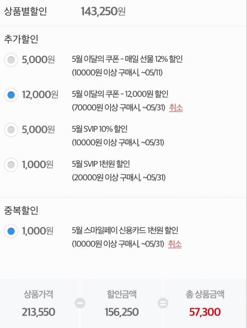 옵션1번은 매일받는 12%할인으로 5,000원할인을, 옵션2~3번은 모두 이달의 쿠폰 12,000원 할인을 받으실 수 있습니다(이미지예는 옵션2번)