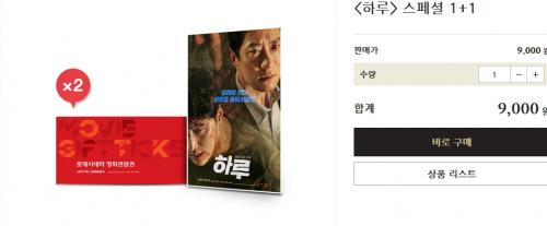 | 1. <하루> 스폐셜 1+1 영화관람권 1매 구매시, 영화관람권 1매가 특별 지급됩니다. (단, 영화관람권은 선착순 2,000명만 구매 가능합니다) 2. <하루> 스폐셜 1+1 영화관람권은 롯데시네마 홈페이지 및 모바일 앱에서 사용 가능합니다. (현장 사용 불가) 3. <하루> 스폐셜 1+1 영화관람권은 ID당 1매만 구매 가능합니다. (신용/체크카드로만 구매 가능) 4. L.point적립이 불가하며, 유효기간 내(관람일 기준) 사용하실 수 있습니다. 5. 결제가 완료된 영화관람권은 마이시네마>나의쿠폰함>영화관람권/할인권 메뉴에서 조회가 가능합니다. 6. 영화관람권의 유효기간은 관람일 기준이며, 구매 즉시 예매 가능합니다. |