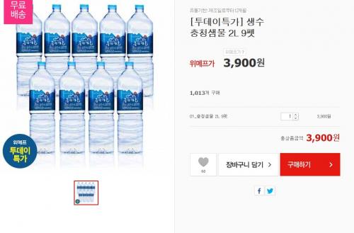 나눠보면 2L 한병당 433원꼴 되겠습니다. 먹는샘물이며 생수 필요하신분은 바로 구매하심 좋을듯 합니다.