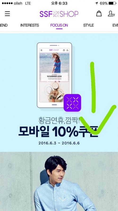 어플 화면에서 사진 상의 동그라미를 클릭 후 10% 할인 쿠폰을 다운로드 받습니다.