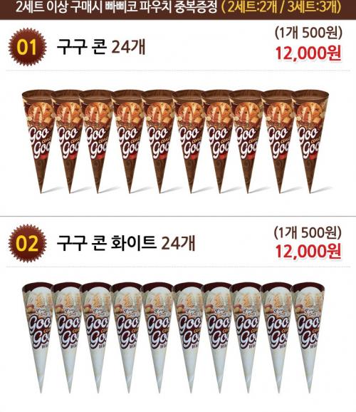 네이버쇼핑에서 구구콘 X 24개를 12000원에 무료배송으로 팔고있습니다. 개당 500원꼴이며 맛은 2가지로 오리지