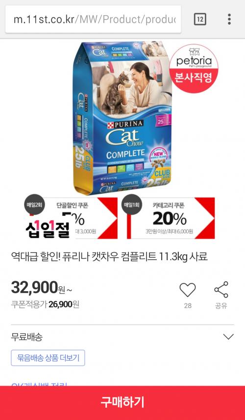 저희집 야옹이 사료 캣차우 키튼 6.35kg 22,340원에 구입 해서 먹이고 있는데