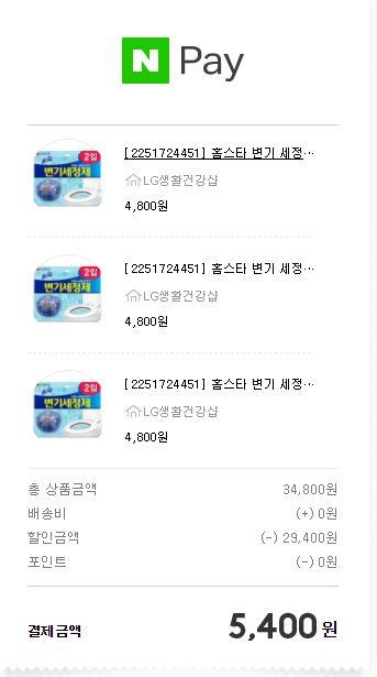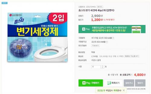 변기세정제를 4개씩 3번 장바구니에 넣습니다.
