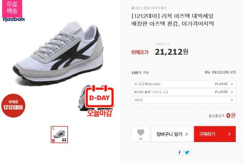 위메프에서 리복 아즈텍 매장판 흰검 운동화를 21212원에 무료배송으로 팔고있습니다. 사이즈 225부터 285 큰사이