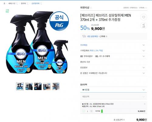 [G마켓] 페브리즈 섬유탈취제 MEN 370ml 2개 + 370ml 추가증정 (9,900원/무료배송)