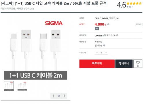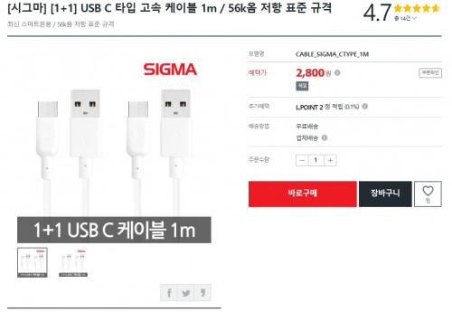 하이마트에서 시그마 C타입 56k 옴 저항 케이블 1M X 2개를 2800원에 무료배송으로 팔고있습니다. 제 기준으로 C