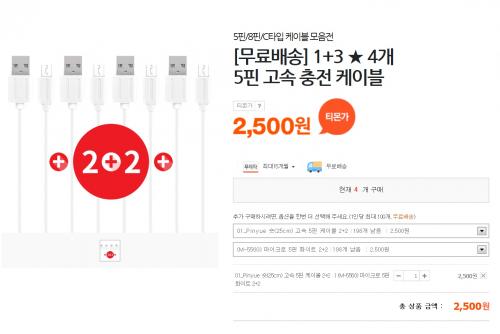 티몬에서 5핀 숏 고속충전케이블 X 4개를 2500원에 무료배송으로 팔고있습니다. 25cm 길이이며 고속충전되는 5핀