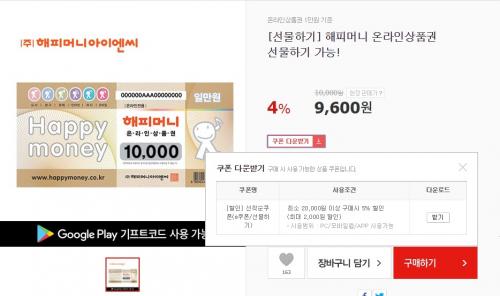 위메프에서 현재 해피머니 온라인 상품권을 4%할인 가격에 판매중인데,