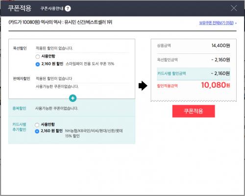 페이지 중간에 있는 SmilePay 전용 도서 쿠폰과 NH농협/KB국민/비씨/현대/신한/롯데 카드 15% 할인을