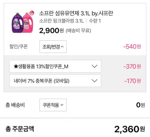 자동으로 들어와있는 생활용품 13%과 경유중복쿠폰 사용하시면 2,360원입니다