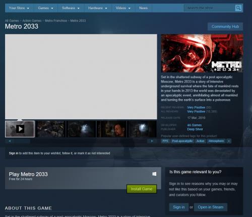 스팀에서 Metro 2033을 24시간동안 무료로 배포하고있습니다. 나름 유명한 게임으로 알고있는데 오늘만 무료배포
