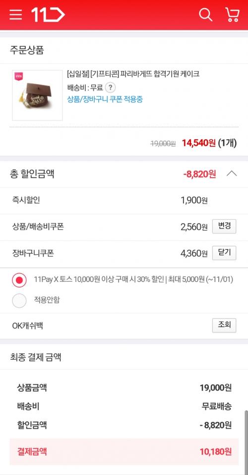 그런데 여기에 오전에 선착순 11,000명에게 발급한 11PAY 토스 장바구니 쿠폰이 적용 가능해서, 오늘 발급 받으신 분들은 46% 할인율로 구매 가능합니다.