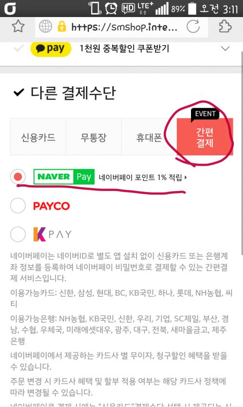 네이버페이 1%적립이벤트 하니 네이버페이 쓰시는분은 네이버페이로 결제하세요~~