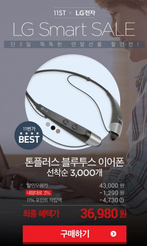 [11번가] LG정품 톤플러스 HBS-500 블루투스 이어폰 (43,000원/2,500원) > 국내핫딜