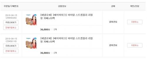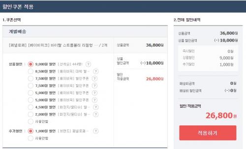 2. 2개 담으시고 결제 전 '쿠폰적용' 클릭하셔서 아래 쿠폰 2종 적용합니다.