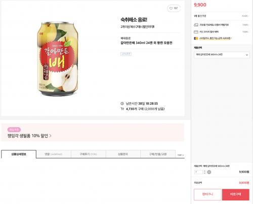 갈아만든 배 340ml 뚱캔 24개이고, '싸면 쟁임각 10%할인쿠폰' 적용하면 8,910원이네요.