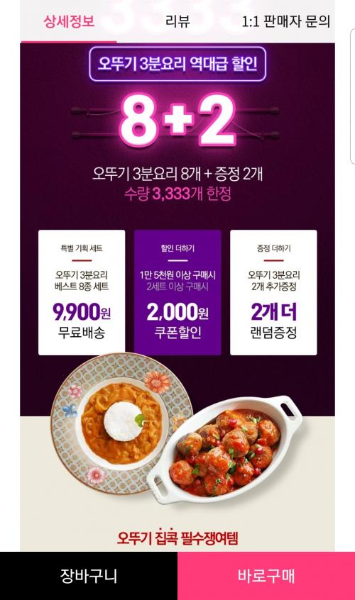 3분요리 10개에 9900원이고, 15000원 이상 구매시 2천원 할인된다고 합니다
