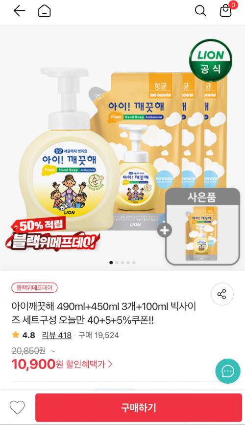 [위메프] 아이깨끗해 490ml+450ml 3개+100ml (10,900원/무료) > 국내핫딜