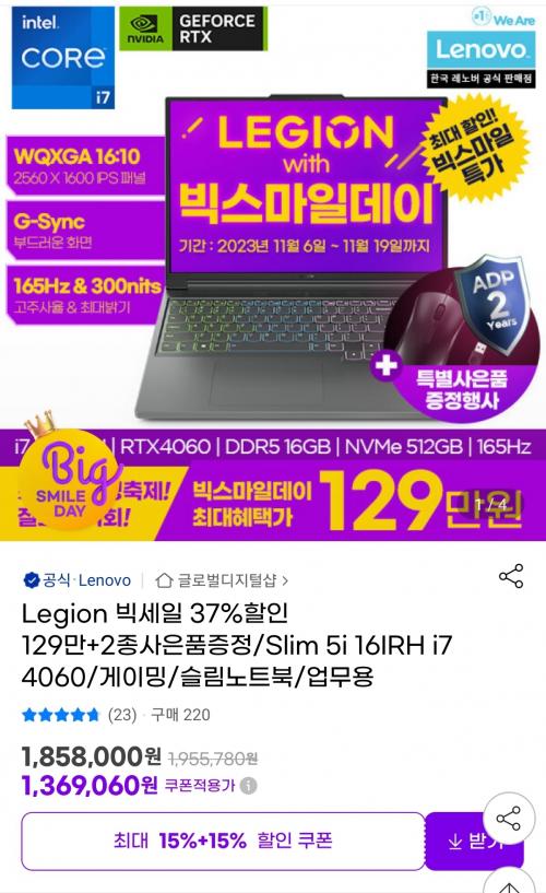 레노버 모델이고 스펙은 RTX4060, Nvme SSD 512G